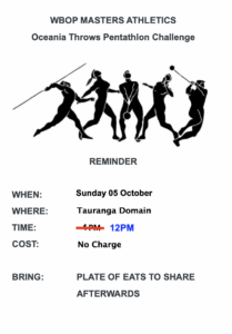 Masters Oceania Throws Pentathlon Challenge Tauranga Domain91 Cameron Road 05oct12:00 pm3:00 pmMasters Oceania Throws Pentathlon Challenge Event DetailsMasters Oceania Throws Pentathlon Challenge is being held at Tauranga Domain. Event Details Masters Oceania Throws Pentathlon Challenge is being held at Tauranga Domain. TimeOctober 5, 2025 12:00 pm - 3:00 pm(GMT+13:00) LocationTauranga Domain91 Cameron RoadOther Events CalendarGoogleCal Get Directions Address - Masters Oceania Throws Pentathlon Challenge [] Destination Address - Masters Oceania Throws Pentathlon Challenge []